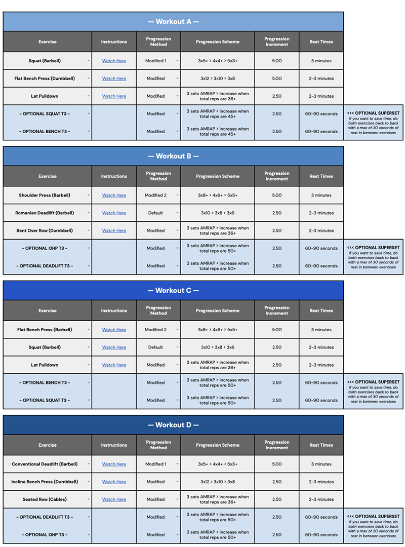 The first difference is that this spreadsheet allows you to customize training variables such as exercise selection and progression methods.